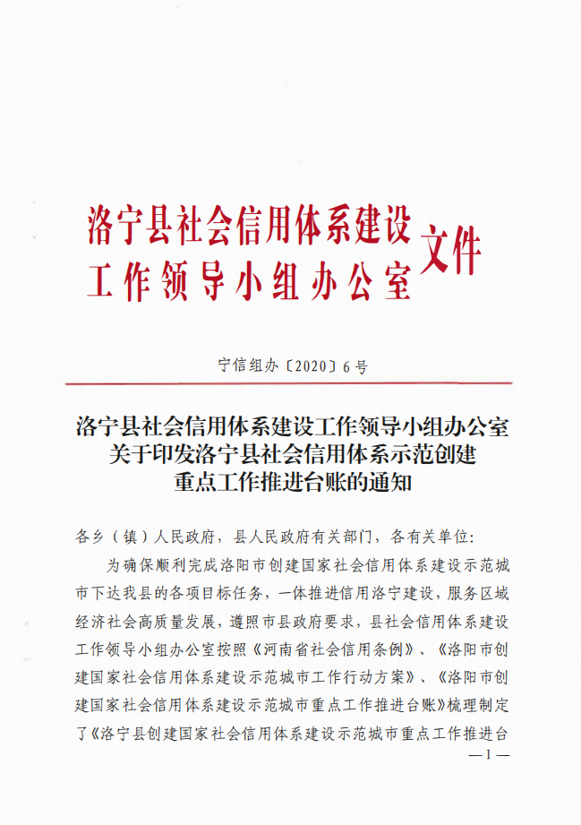洛宁县社会信用休系建设工作领导小组办公室关千印发洛宁县社会信用休系示范创建重点工作推进台账的通知